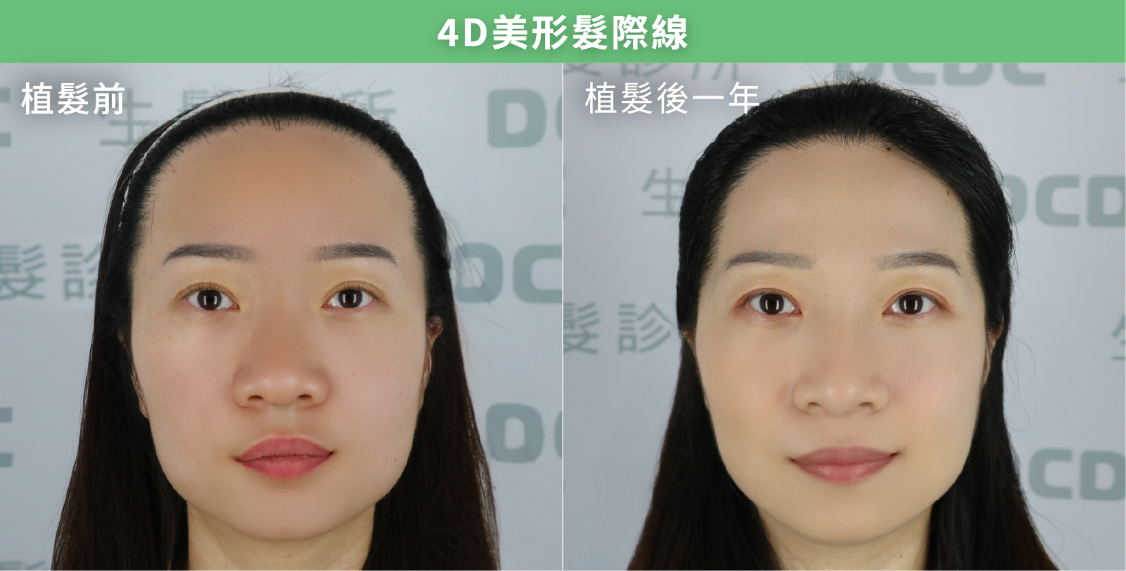 一七其實一直很喜歡中分和把頭髮往後梳的造型,卻因為高額頭跟貓耳朵的關係而不敢嘗試,直到身邊朋友做了美形髮際線植髮後推薦她,她才終於下定決心到DCDC諮詢。