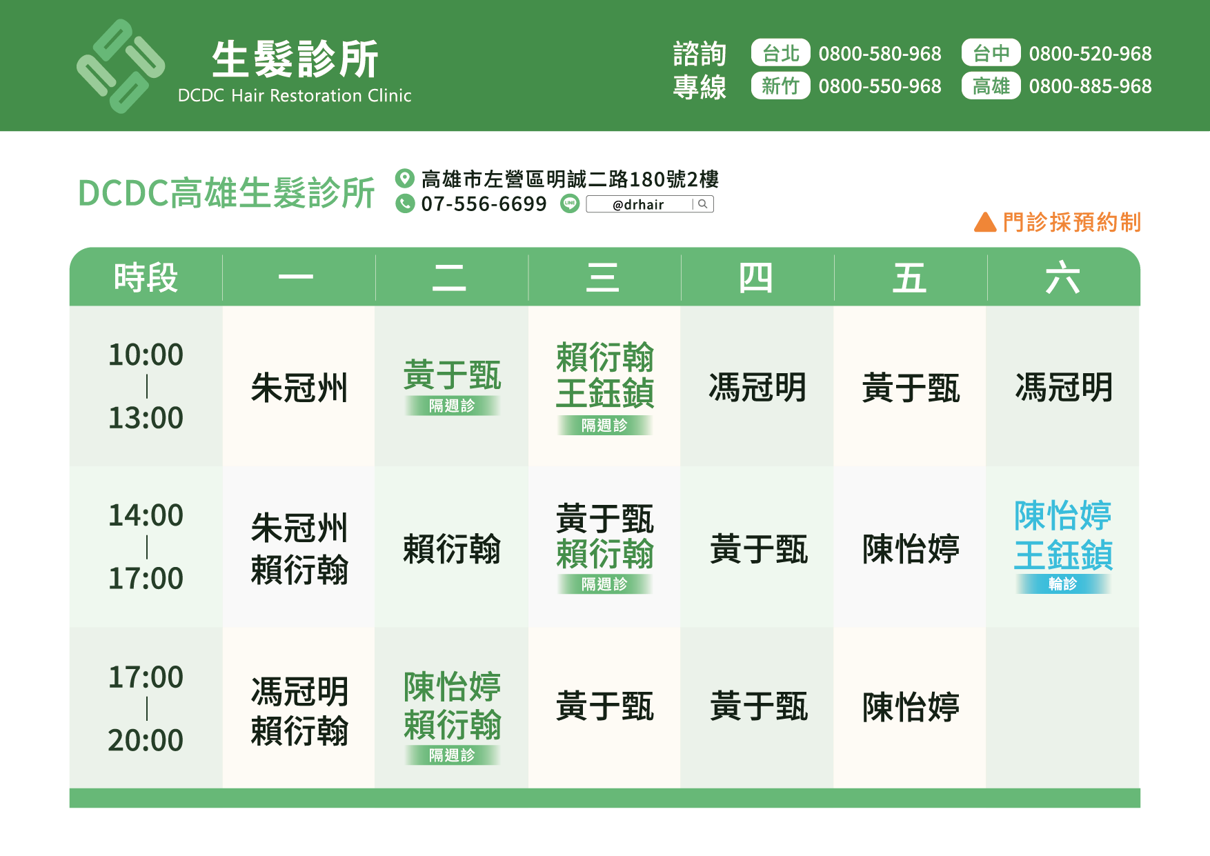 搭乘高雄捷運紅線至 「巨蛋站」下車→巨蛋站2號出口旁邊「裕誠路」上即是公車站(1號出口對面)→搭乘3號公車→在「河堤公園(明誠二路)」站下車(5站即到),對面就是DCDC高雄生髮診所